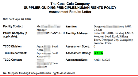 Chúc mừng Công ty TNHH Vật phẩm và quà tặng Đông Quan Tư Di Văn phòng đã vượt qua thành công vòng kiểm tra nhà máy của Coca-Cola năm 2026, đồng thời nhận được nhãn xanh có hiệu lực trong 3 năm.